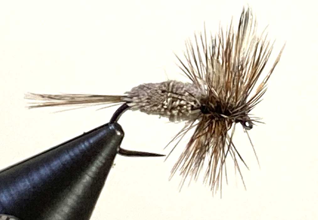 アダムス・イリジスタブルは、一般的なアダムスに比べて「ボディ」にエルクヘアー(鹿毛)を使用しており、浮力が高い点が特徴です。これにより、流れの速い川や波立つ水面でも安定して浮き続けます。特にライズする魚を狙う際に、その違いが効果を発揮します。