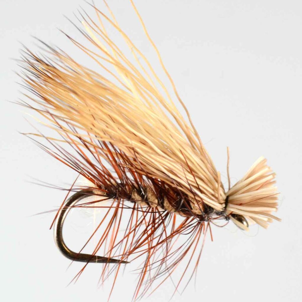 エルクカディスは、ドライフライの定番中の定番であり、そのデザインは水生昆虫であるトビケラの成虫を模倣しています。ヘラジカの毛(エルクヘア)を使用したボディは高い浮力を持ち、水面でしっかりとした存在感を示します。水面に浮かぶそのシルエットは、魚にとって非常に自然で、誘引力が高いのが特徴です。また、耐久性があり、何度もキャストしても形状が崩れにくい点が多くの釣り人から支持されています。