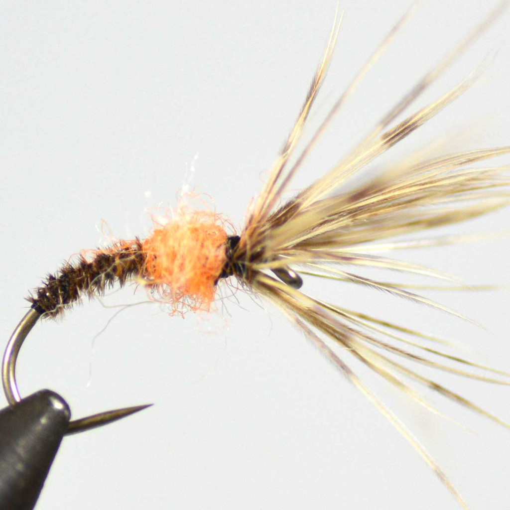 ハックルが前方に立ち上がり、水中でゆらめく動きが魚の本能を刺激。初心者でも扱いやすい定番パターン。